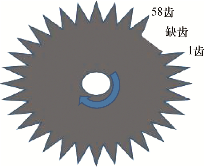 通过曲轴位置传感器信号判断发动机的初始停缸位置。图 10为曲轴位置信号盘示意图,信号盘原有58个齿,每2个齿之间代表曲轴转角为6°。