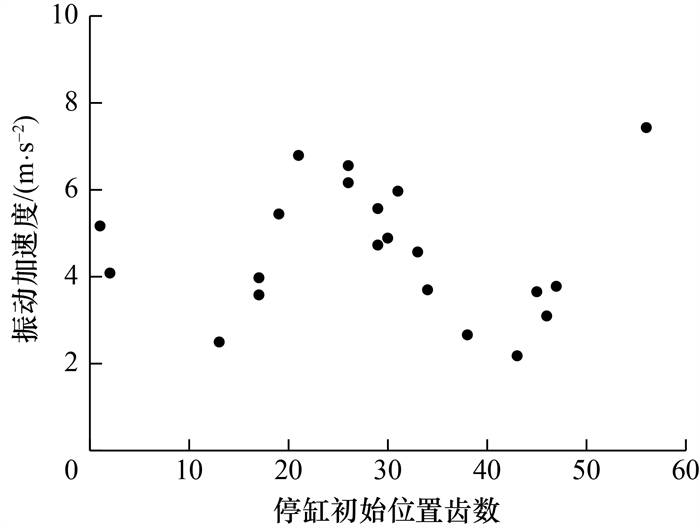 将图 8中20组数据的横坐标转化为停缸初始位置齿数,获得的20次测试下发动机振动与停缸初始位置关系如图 11所示。可以看出,发动机介入抖动的量级随曲轴齿位呈正弦规律变化:在58和30齿附近抖动量级较大,在15和45齿附近抖动量级较小。