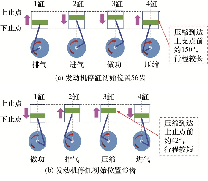 图 12为发动机停缸初始位置分别为56和43齿的活塞运行原理图。可以看出,当发动机停缸初始位置在56齿时,第4缸处于压缩行程初期,离压缩上止点150°,此时压缩行程较长,因此造成第一循环缸压的峰值较大,如图 12a所示;当发动机停缸初始位置在43齿时,第3缸处于压缩行程末期,离压缩上止点42°,此时压缩行程较短,造成第一循环缸压的峰值较低,如图 12b所示。