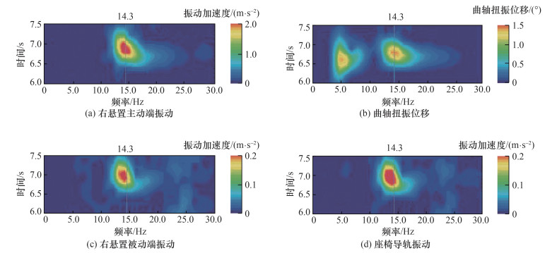 从图 13中可以看出,右悬置主被动端振动、座椅导轨振动和曲轴扭振位移的峰值频率均出现在14.3 Hz附近。因此,本文推测,机理为动力总成刚体模态和传动系扭转模态耦合,导致座椅导轨振动大。