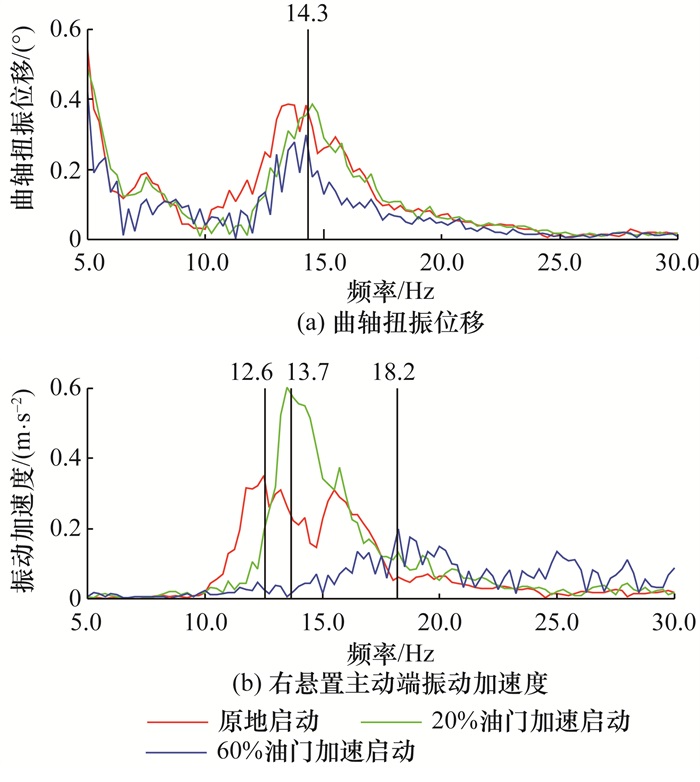 3.2.2 传动系扭转模态及动力总成刚体模态的耦合分析由图 5主观评价结果可知,原地启动或者60%油门加速启动工况下,发动机介入时整车抖动都较20%油门加速启动工况下轻微。因此,选取了原地启动、20%油门加速启动和60%油门加速启动这3种工况下的相同停缸初始位置的数据进行对比分析。图 14为3种工况下发动机介入抖动的频域分析。可以看出,3种工况下曲轴扭振位移的峰值频率都处于14.3 Hz附近,且峰值频率变化较小,推测该频率为传动系扭转模态频率。采用式(3)进行计算,传动系扭转模态频率为14.4 Hz,与实测结果吻合较好。