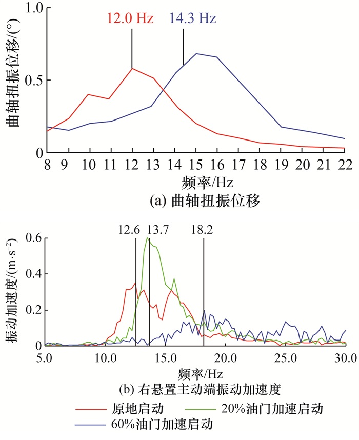 由图 14还可以发现,20%油门加速启动工况下发动机振动峰值频率(13.7 Hz)和传动系扭转模态频率(14.3 Hz)最接近,因此20%油门加速启动工况下发动机振动峰值最大,主观感受最差。而原地启动和60%油门加速启动这2种工况下发动机介入瞬间的发动机振动峰值频率分别为12.6和18.2 Hz,与传动系扭转模态频率分别避频1.7和3.9 Hz,因此这2种工况下的发动机振动峰值下降显著。本文推测,3种工况下发动机振动峰值频率为动力总成的刚体模态频率,会随着工况变化而变化。
