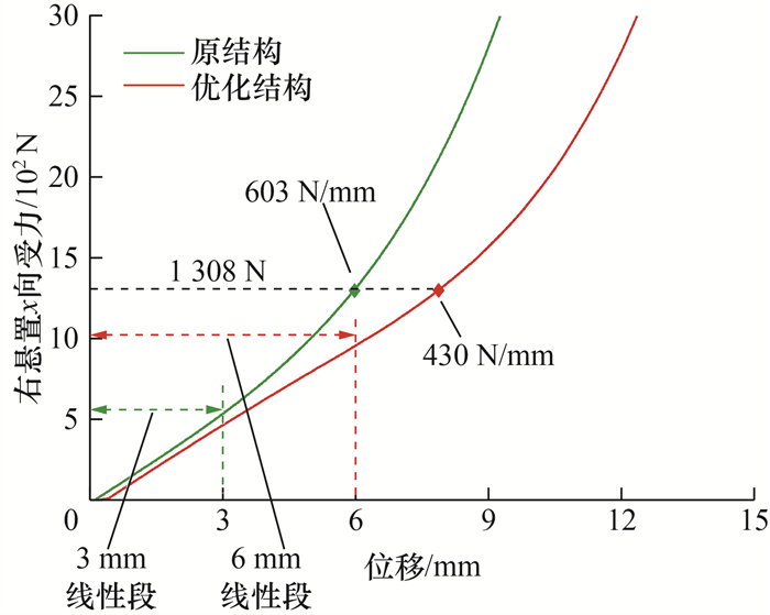 | 图 17 右悬置优化前后的右悬置x向受力与位移的关系曲线对比 |