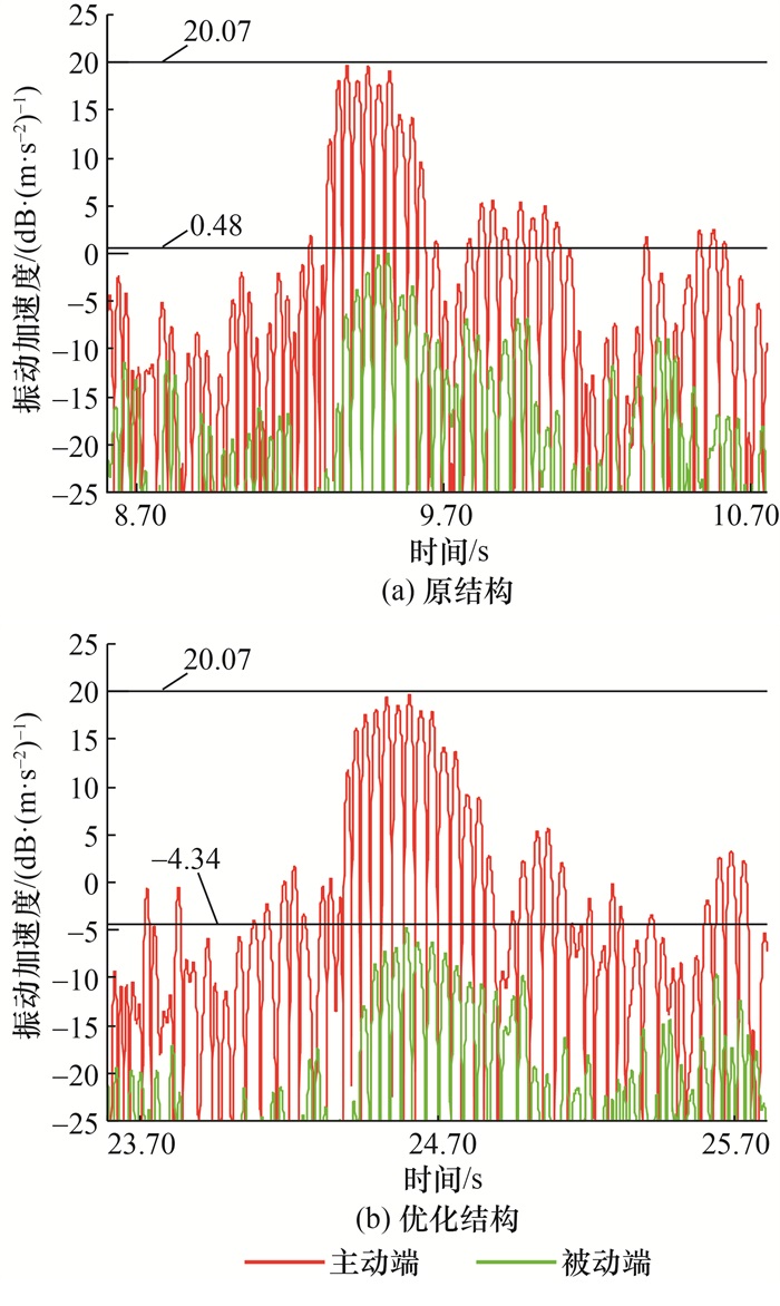 将优化结构右悬置装车进行实车测试验证。在20%油门加速启动工况下,原结构和优化结构的测试结果对比如图 18所示。可以看出,优化前后的主动端振动差异较小,而被动端振动加速度由0.48 dB/(m·s-2)下降为—4.34 dB/(m·s-2),表明结构优化后右悬置的隔振率明显提升。