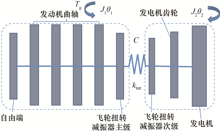 在发动机介入工况下,离合器始终处于断开状态,因此仅对发动机-飞轮扭转减振器-发电机系统建立动力学模型。图 3为发动机介入工况下混动总成等效动力学模型。其中:C和ktor分别为飞轮扭转减振器的阻尼系数和扭转刚度;θ1和θ2分别为飞轮扭转减振器主级侧和次级侧的扭转角;将发动机曲轴系统、飞轮扭转减振器主级的惯量等效为转动惯量J1,即飞轮扭转减振器主级侧的转动惯量;将飞轮扭转减振器次级、发电机齿轮和发电机的惯量等效为转动惯量J2,即飞轮扭转减振器次级侧的转动惯量。