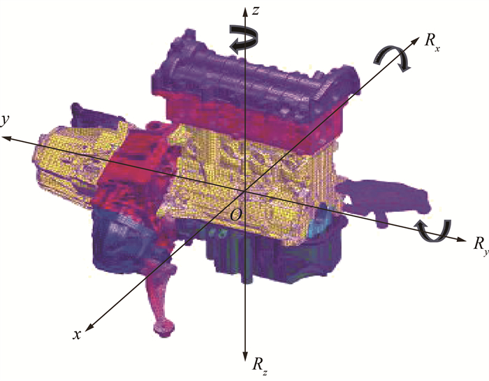 1.2 动力总成刚体动力学模型动力总成和悬置构成的装配体具有六自由度低频刚体模态,分别为沿x、y、z轴方向的平动和绕x、y、z轴方向的转动(即Rx向、Ry向和Rz向),动力刚体模态示意图如图 4所示。