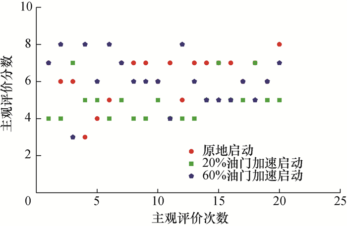 2 问题现象描述和实验方案设计电池荷电状态(state of charge, SOC) 指电池当前电量与最大容量的比值。该混动车型处于低电量状态(SOC约为18%),以小油门(约20%油门深度)从原地开始加速,首先靠驱动电机起步,当加速至车速约20 km/h时,ISG反向拖动发动机介入工作,在发动机介入瞬间,整车存在明显抖动冲击感,驾驶员侧抖动强烈,主观体验极差。图 5为各种工况下的主观评价分数记录,其中6分以下为不能接受,7分以上为较好水平。通过多次主观评价发现,该抖动现象的量级存在随机性,有时抖动较大、有时抖动较小。此外,在主观评价中还发现,原地启动或者以60%油门加速启动时,发动机介入时整车抖动都较轻微。