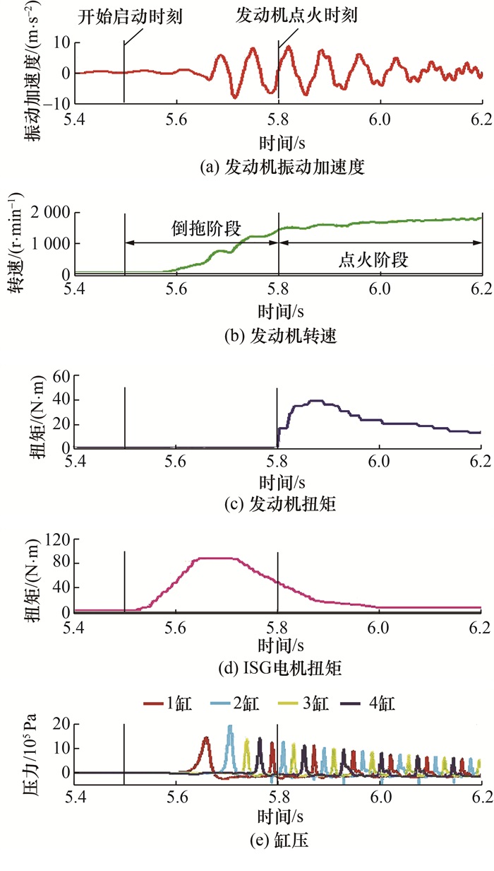 由于发动机介入瞬间各点的振动时域数据包含非发动机主阶频率成分,因此对信号进行5~30 Hz滤波处理。图 7为20%油门加速启动工况下发动机介入抖动的一组测试结果。可以看出,ISG开始倒拖发动机时发动机并未点火,在倒拖阶段中,该发动机采用了超高压缩比(ε=15.5),缸内残余气体被压缩后产生较高的缸压,导致发动机产生剧烈的振动;当发动机被ISG拖至一定转速后,ISG开始卸载扭矩,发动机开始点火、正向带动ISG工作。由图 7可以看出,最高缸压出现在倒拖阶段,而非点火阶段。