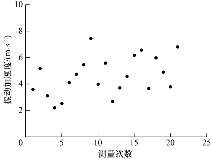 对20%油门加速启动工况下发动机介入抖动的20组数据进行了统计,20次测试下发动机振动与测量次数关系如图 8所示。可以看出,随着采集次数变化,发动机介入抖动的量级存在波动,抖动量级呈随机性。