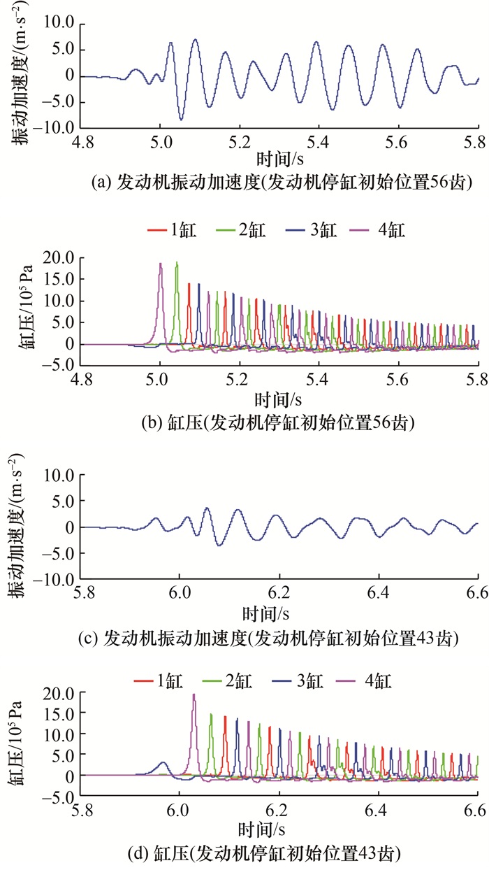 为了分析发动机介入抖动量级具有随机性的原因,选取抖动量级差异较大的2组数据(第4组和第9组)进行深入分析。图 9为20%油门加速启动工况下发动机介入抖动的发动机振动与缸压的关系,其中图 9a和9b的发动机停缸初始位置为56齿,图 9c和9d的发动机停缸初始位置为43齿。可以看出,发电机反拖发动机介入瞬间,二者的第一循环缸压存在明显差异;第一循环缸压的峰值越大,则发动机振动的幅值越大,表明发动机介入瞬间第一循环缸压的大小决定抖动量级。在发动机介入瞬间,发动机并未点火,因此第一循环缸压激励不是由燃烧产生的,而是由活塞压缩缸内气体产生的。据此推测,第一循环缸压的差异造成两者的初始停缸位置差异。