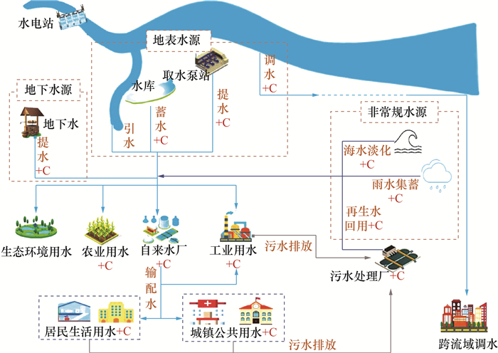 1 研究方法与数据来源 1.1 社会水循环碳排放综合测算模型构建方法基于生命周期理论,本研究将社会水循环全生命周期划分为取水、供水、用水、排水四大环节。其中:取水环节主要指从江河、湖泊、地下水、非常规水等水源取水的过程,具体包括地表水蓄引提调、地下水提水、海水淡化、雨水集蓄、再生水等;供水环节包括制水和送配水;用水环节分为农业、工业、居民生活和城镇公共用水;排水环节指污水的收集、输送、处理、回用和排放。