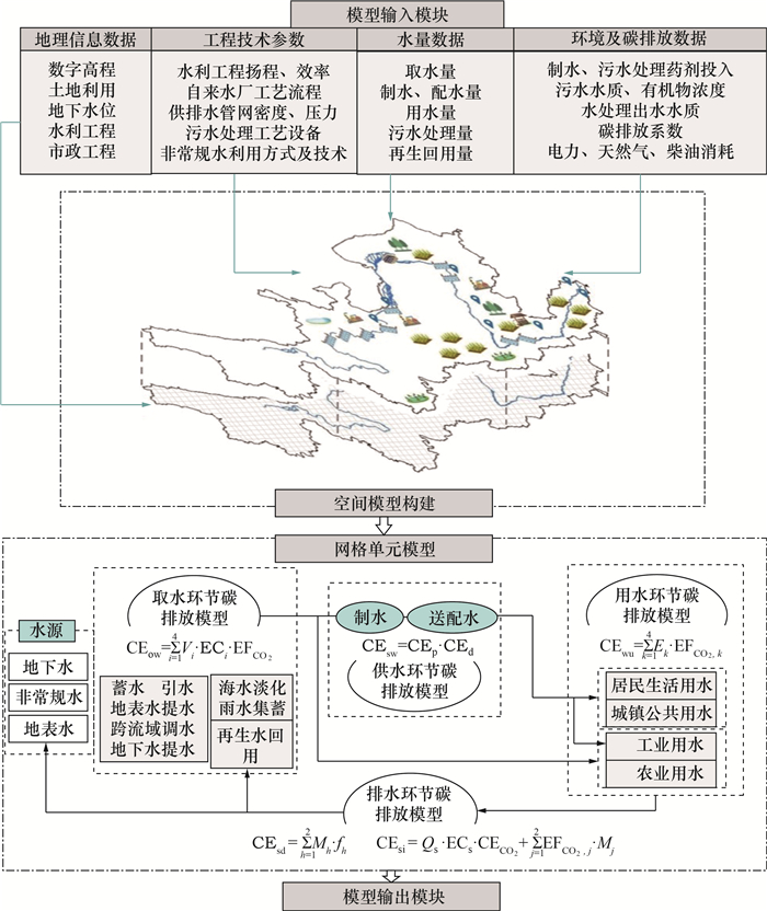 本研究构建的社会水循环碳排放综合测算模型如图 2所示。输入模块包括社会水循环各环节相关的水量、地理信息、技术参数等数据。以取水点、制水厂、用水户及污水处理厂为基础映像节点,将社会水循环过程进行空间展布,利用网格内河/渠网面积系数、地下水位和管网密度描述每个网格内的水循环特征。考虑取水、供水、用水、排水环节特性差异,分别构建计算模块。基于各网格水量数据,计算各环节直接和间接碳排放,从而模拟区域社会水循环相关碳排放过程。
