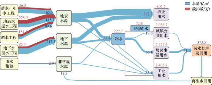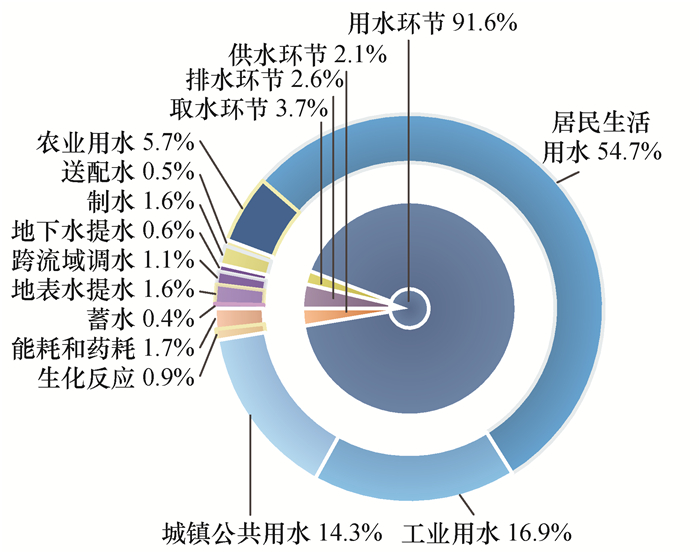 2020年9月,中国提出碳达峰及碳中和目标。实现碳中和对遏制全球气候变化具有重要意义,需要全社会为之共同努力[1]。水是保障人类生存和经济社会发展不可或缺的基础资源[2],近年来水资源利用相关的碳排放问题逐渐成为国内外研究热点[3]。目前,相关研究主要集中在污水处理环节的碳排放和居民生活用水能耗。研究结果显示:全球温室气体排放量的约1.6%和电力消耗的3.0%发生在污水处理行业[4];美国加利福尼亚州与水相关的住宅终端消耗了区域15.1%的天然气和5.4%的电力[5];在中国,与水相关的电力消耗约占全国的3.4%[6]。随着城市快速发展、人口数量增长和人民生活水平提高,用水需求以及污水处理规模日益增大[7],水资源利用相关的碳排放量将不断增加。