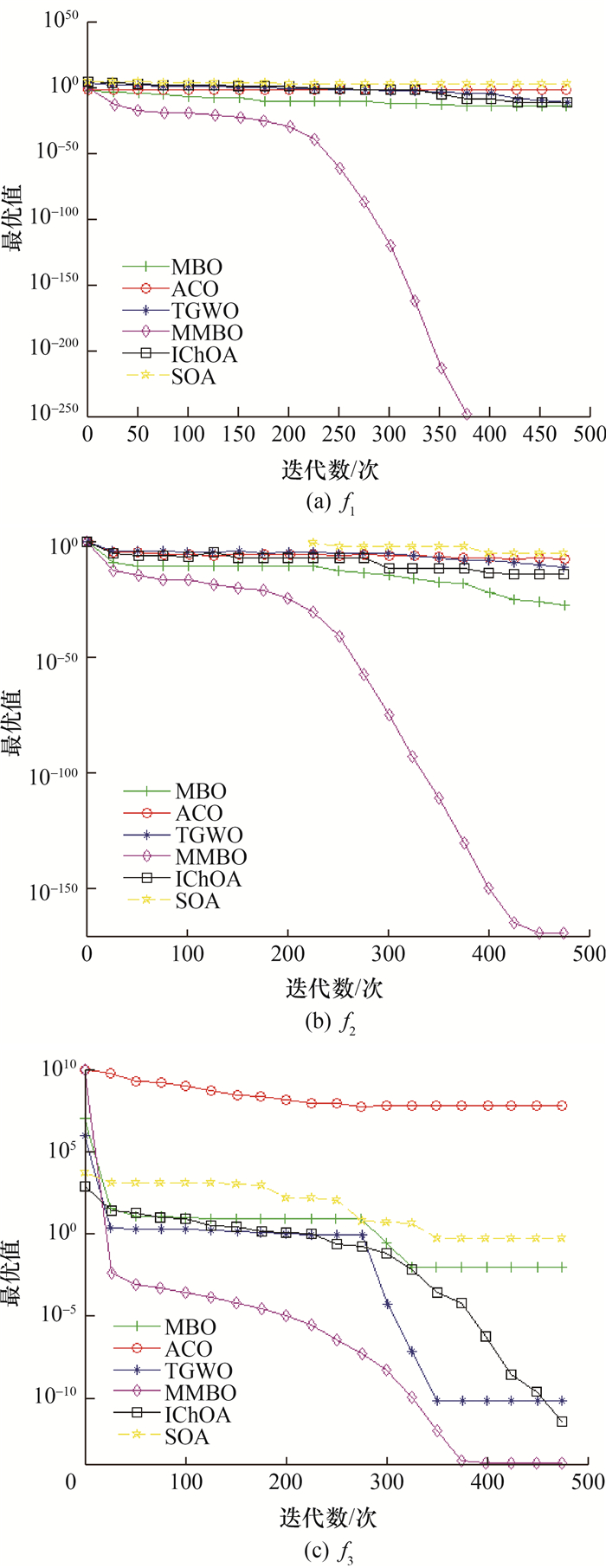 IChOA是一种基于翻筋斗觅食策略的改进黑猩猩优化算法;TGWO算法是一种基于Tent混沌映射初始化种群的改进灰狼算法,ACO算法和SOA作为经典的群智能优化算法,已被运用在不同的学科和工程领域。各算法的设置参考了文[10-13],如表 3所示。以最优值、平均值、标准差作为算法性能的评价指标,实验结果如表 4所示。可以看出,MMBO在所有测试函数的结果均优于其他算法。对于函数f1和f2,MMBO能够寻找到理论最优值,寻优性能明显优于其他算法,说明改进算法具有较高的开发寻优能力,能够提高收敛精度。而对于其他测试函数,MMBO也能够寻找到更接近理论最优值的值,表明算法在自适应的调整率下跳出了函数的局部极值,提高了全局搜索能力。