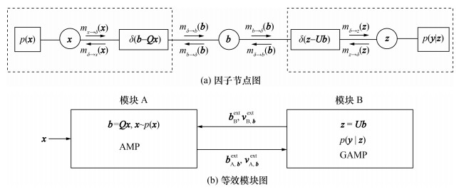 如图 1[15]所示,GUAMP算法可以通过构建因子节点图来说明其推断过程。图 1a中:圆圈表示变量节点,可以推断对应变量边缘分布;方框表示因子节点,包含模型中先验与观测信息;mx→δ(x)表示从节点x传递到节点δ的消息,实际上表征的是变量x的伪线性观测分布,由于该分布为Gauss分布,可以使用分布的均值