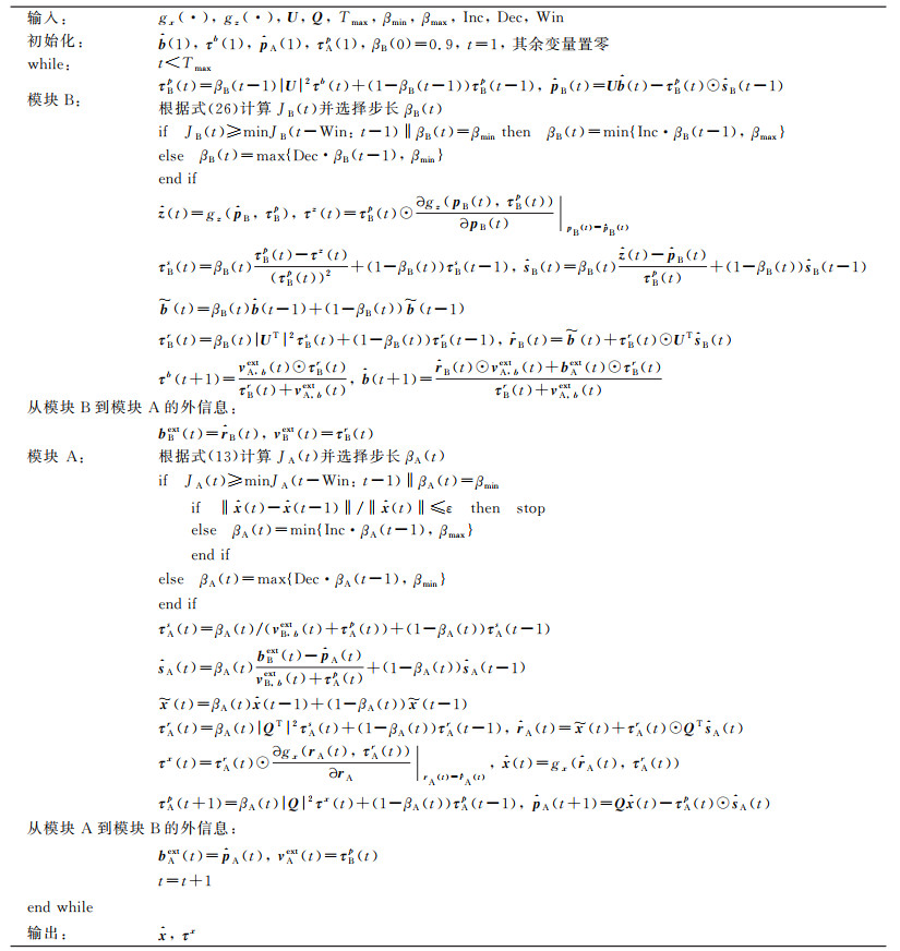 GUAMP算法的详细步骤请参考文[15]。将上述自适应步长选择规则耦合到GUAMP算法中,即可得到AD-GUAMP算法,如图 2所示。图中:gx(