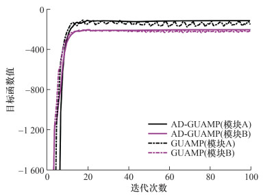 AD-GUAMP算法为两个消息传递模块分别设计了目标函数。下面以相关测量矩阵为例说明目标函数的收敛情况。仿真条件设置如下:信噪比SNR=40 dB,2 bit量化,过采样因子δ=0.8,测量矩阵的相关系数ρ=0.1,其他仿真参数与之前设置的仿真参数保持一致。图 2绘制的函数曲线为-JA(t)与-JB(t),可见目标函数值会随着迭代次数的增加而不断上升。从图 3可以看出,GUMAP算法由于没有进行步长自适应调整,两个模块对应的目标函数值(虚线)会在平衡点附近不断振荡。AD-GUAMP算法则由于增加步长调整机制,两个模块的目标函数值(实线)均稳定上升,经一定迭代次数最后收敛到某个值。此外,从图 2还可以看到,对同样的仿真场景,GUAMP算法两个模块的目标函数值均低于AD-GUAMP算法的两个对应模块。可以预见,采用自适应步长方法后,AD-GUAMP算法性能将优于GUAMP算法性能。