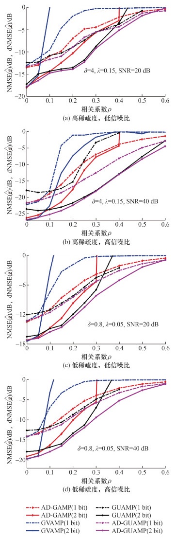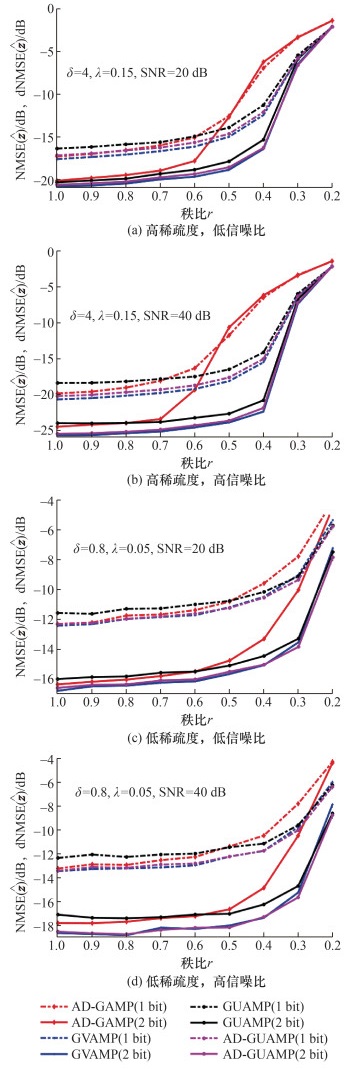 图 4展示了随着矩阵秩比的变化算法NMSE(2 bit量化)或dNMSE(1 bit量化)的结果。图 4a和4c中,信噪比为20 dB;图 4b和4d中,信噪比为40 dB。图 4a和4b对应于过采样,过采样因子为δ=4,稀疏度λ=0.15。图 4c和4d对应于欠采样,过采样因子为δ=0.8,稀疏度λ=0.05。从图 4a可以看出,在1 bit量化下,GVAMP算法的NMSE相对于AD-GUAMP算法低约0.4 dB,表明GVAMP算法的性能最佳,AD-GUAMP算法略逊于GVAMP算法,但优于GUAMP和AD-GAMP算法。当秩比r>0.6时,AD-GAMP算法优于GUAMP算法。然而,随着秩比的减小,即矩阵变得更低秩,AD-GAMP算法的发散现象严重,此时GUAMP算法的性能优于AD-GAMP算法。在2 bit量化下,GVAMP算法的NMSE相对于AD-GUAMP算法低约0.25 dB,表明GVAMP算法稍优于AD-GUAMP算法,但GUAMP算法仍优于AD-GAMP算法。图 4b、4c和4d的结果与图 4a基本一致,即矩阵接近满秩时,GUAMP算法的性能仍高于AD-GAMP算法,随着矩阵秩比的减小,GUAMP算法的性能略低于AD-GAMP算法。在欠采样情况下,AD-GUAMP算法和GVAMP算法的性能非常接近。总之,随着秩比的减小,所有算法的性能都会恶化,但在低秩情况下,AD-GAMP算法的恶化现象更为严重,其性能明显低于其他算法,而其他算法在不同秩比下的性能相近。相对于GVAMP和AD-GUAMP算法,GUAMP算法有轻微的性能损失。