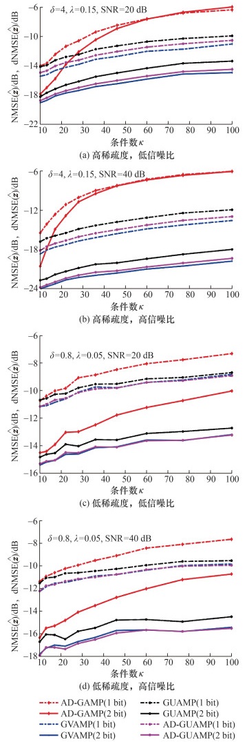图 5展示了随着条件数κ的变化算法NMSE或dNMSE的变化曲线。图 5a和5c中,信噪比为20 dB;图 5b和5d中,信噪比为40 dB。图 5a和5b对应于过采样,过采样因子为δ=4,稀疏度λ=0.15。图 5c和5d对应于欠采样,过采样因子为δ=0.8,稀疏度λ=0.05。从图 5a可以看出,在1 bit量化下,GVAMP算法的dNMSE相对于AD-GUAMP算法低约0.6 dB,其重构性能最佳。其次是AD-GUAMP算法,两者的性能相近,并且均优于AD-GAMP和GUAMP算法。对于所有测试条件数,GUAMP算法的性能均优于AD-GAMP算法。在2 bit量化下,结果与1 bit量化场景类似。图 5b(过采样、高信噪比)、5c(欠采样、低信噪比)和5d(欠采样、高信噪比)的结果与图 5a基本一致。在欠采样情况下,AD-GUAMP算法和GVAMP算法的性能非常接近。同时,在高信噪比情况下,AD-GAMP算法相对于其他算法的性能恶化更为严重。总之,随着条件数κ的增加,所有算法的重构性能都变差,其中AD-GAMP算法最不稳健,其次是GUAMP算法。AD-GUAMP算法的重构性能非常接近GVAMP算法,尤其在低过采样因子和低稀疏度的情况下,两者的重构性能几乎完全一致。