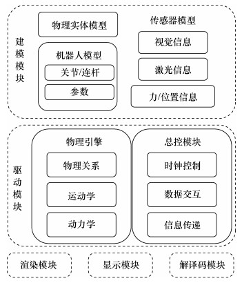 1 基于机器人建模的测控仿真方法 1.1 机器人仿真平台组成架构常见机器人仿真平台架构如图 1所示,机器人仿真平台的核心模块是建模模块和驱动模块,同时还配置基于计算机图形学的显示模块、增强图像可视化质量的渲染模块以及解译码模块。