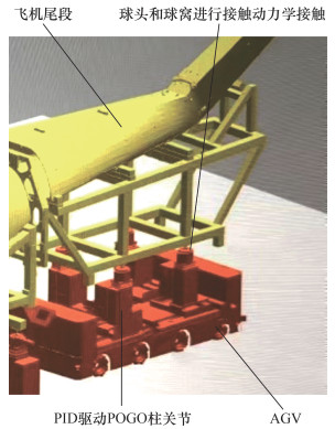 在仿真平台中对运动控制机构建模。AGV运输车和天梯等运输设备通常建立为3自由度移动机器人,通常只需关注其运动学性能来表征运输位置,而无需关注动力学性能。串并联调姿态机构可直接按照其构型在机器人仿真平台中进行机器人建模,为其配置关节驱动器和关节控制器,其动力学特性可以用于调姿控制算法的验证和分析。该类调姿态机构具备动力学特性,仿真引擎可直接对调姿机构进行力空间的PID控制,从而驱动设备在仿真环境中执行接触动力学交互。图 2为一个由AGV搭载的4个3自由度POGO柱组成的并联调姿系统,通过球窝和飞机舱段工装球头进行动力学交互和调姿控制的仿真示意图,可通过仿真程序预先执行调姿轨迹,检验POGO柱控制算法有效性。高精度测量设备可以将其可运动部分建立为机器人关节,并在其机器人末端附加测量传感器,如激光跟踪仪可以建立为底座具备3个平动自由度和末端具备2个转动自由度的5自由度机器人,并且在其末端附加一个激光雷达,以仿真其激光测距性能,并辅助站位规划。