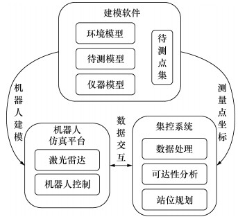 仿真系统中各个元素的动态交互关系如图 3所示:建模软件中进行待测量部件模型,测量环境模型和测量仪器模型的建模,待测量部件模型上提取测量点的三维坐标(xi, yi, zi), i=1, 2, …, n;机器人仿真平台将直接导入待测量部件模型和测量环境模型,并完成激光雷达机器人模型的搭建和关节驱动器的控制;集控系统包含测量可达性分析算法,接受仿真平台的实时数据和建模软件提供的测量点的三维坐标,进行测量可达性分析;可以在测量可达性分析算法的基础上,设计激光跟踪仪组合站位优化算法,利用网格化分析和计算,寻找具有最优指标的测量组合站位。