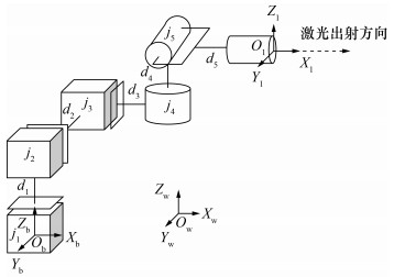 世界坐标系为Ow-XwYwZw,机器人基座坐标系Ob-XbYbZb固定于地面上,其到世界坐标系的齐次变换矩阵为Tw, b。机器人从基座到末端执行器依次具备沿Zb方向的平动关节j1、沿Yb方向的平动关节j2、沿Xb轴方向的平动关节j3、绕Zb方向的转动关节j4和绕Yb方向的转动关节j5,末端执行器为激光发射装置和测量头,在激光发射装置末端中心固定坐标系Ol-XlYlZl,机器人关节j1与j2、j2与j3、j3与j4、j4与j5、j5与末端执行器之间的连杆长度分别为d1、d2、d3、d4、d5。为了方便后续运动学计算和关节控制,设置激光从Ol点沿Xl方向出射,d1=d2=d4=d5=0。由于激光跟踪仪测量头的2个转动关节通常位于整体设备的垂直轴线上且彼此重合,因此将其3个平动关节都设置于激光跟踪仪底部中心,则j3和j4之间的齐次变换矩阵T3, 4仅包含平移变换,即