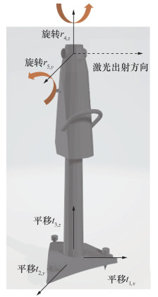 其中:lx3, 4、ly3, 4、lz3, 4为d3的3个分量,具体数值可以根据激光跟踪仪的物理尺寸计算或读取仿真中的数据获取。将上述机器人结构关系配置到实际的机器人3-D物理模型中,得到机器人模型及其运动自由度表征如图 5所示,机器人5个关节的平动/转动量按顺序分别表示为t1, x、t2, y、t3, z、r4, z、r5, y。