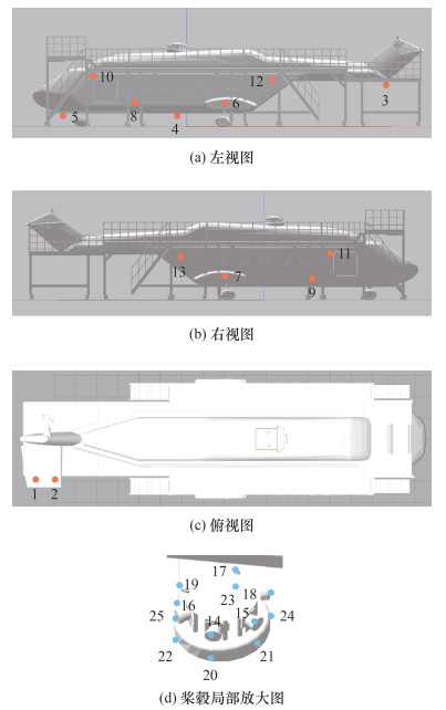 4.2 测量环境介绍图 8给出了测量场整体环境,测量场中包含一架某型号直升机,其附近安装了一圈工作梯。图 9表示机身上测量点的分布信息,其中直升机的平尾下部、机身底部蒙皮、短翼蒙皮和机身蒙皮和桨毂上分别布置测量点1—2、测量点3—5、测量点6—9、测量点10—13、测量点14—25。场景中共10台激光跟踪仪,其中4台激光跟踪仪(激光跟踪仪1—4)用于测量这25个测量点,其余跟踪仪用于其他用途(已预先布置好),因此只需要对这4台跟踪仪进行测量可达性分析和站位规划。为了保证系统能够测量到桨毂上的测量点,为其中2台激光跟踪仪设计了4 m高的支架,通过地脚螺栓固定于地面,另外2台激光跟踪仪用其自身支架固定于地面上。