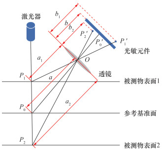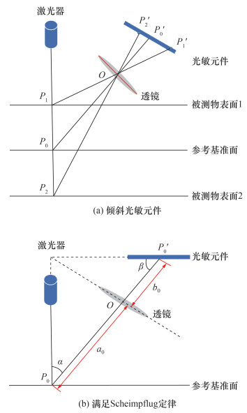其中:a0和b0分别为参考基准面处P0的物距和像距;α为激光平面与透镜主光轴的夹角;β为光敏元件的倾斜角。