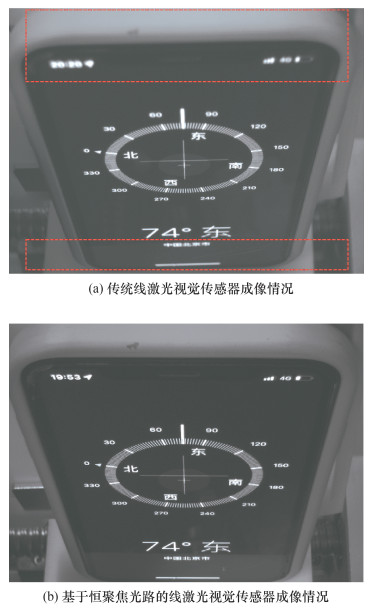 为说明恒聚焦光路的优越性,对2种光路的传感器进行对比实验。传统线激光视觉传感器成像情况如图 3a所示,传统线激光视觉传感器在采集图像时,中心聚焦处能清晰成像,但成像的清晰程度随着偏离中心逐渐降低。当传感器需要大范围检测时,图片两端区域由于偏离中心过多,成像质量很难满足高精度检测需求。而基于恒聚焦光路设计的线激光传感器成像情况如图 3b所示,可视范围内均能清晰成像。