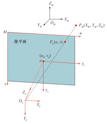 针孔模型是传统相机应用最广泛的成像模型,它是基于小孔成像的物理思想描述三维空间中的一点到像平面上二维像素点的转换关系。传统相机针孔模型成像图如图 4所示。针孔模型涉及4个坐标系的转换,分别是世界坐标系OW-XWYWZW、以相机镜头光心OC为原点的相机坐标系OC-XCYCZC、像平面上以像主点o为原点的图像物理坐标系o-xcyc和以像平面左上角M点为原点的图像像素坐标系M-uv。