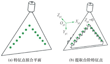 提取台阶特征点如图 6b所示,本文将光平面投射至双边台阶,采集光平面与每层台阶交线的中点作为光平面拟合所需点。为了获得qpl, e在OC-XCYCZC下的坐标,首先,建立台阶坐标系Opl-Xpl Ypl Zpl,并令光平面位于Zpl=0处;其次,将qpl, e对应的像点(ue, ve)进行去畸变处理[17],获得无畸变的像素坐标(uud, e, vud, e);最后,可根据式(8)得到像素坐标系到台阶坐标系的单应性关系, 表示如下: