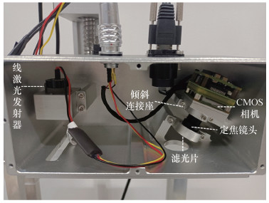 4 实验验证 4.1 实验布置为了验证标定算法可行,设计和加工了一款基于恒聚焦光路的线激光视觉传感器。恒聚焦线激光视觉传感器主要由采集图像的镜头和相机、调整光路的倾斜连接座、产生激光平面的线激光发射器及提高激光成像质量的滤光片构成,如图 7所示。根据应用需求,上述关键元件的选型或加工如下:相机选择型号为MV-CB016-10GM-C的海康威视公司板级CMOS相机(分辨率为1 440×1 080,像元尺寸为3.45 μm×3.45 μm);镜头选用12 mm焦距的定焦镜头;根据恒聚焦光路的几何限制,加工了倾角为6°的倾斜连接座;分析应用场景中杂光的最弱波段,线激光发射器发射的激光波长选择658±5 nm,并在镜头前安装相应波长段的窄带滤光片。