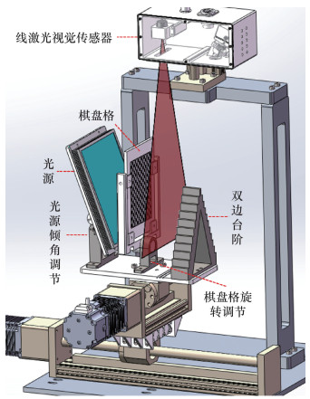 本文标定方案中,线激光视觉传感器需要棋盘格、双边台阶分别标定相机内参、光平面参数。此外,为提高算法的鲁棒性,标定过程还需不断调整传感器与标定物间的相对位姿[17]。为精简操作步骤、减少人工干预,设计了一体化的自动标定装置,如图 8所示。