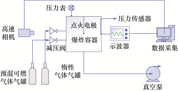 1 实验装置和方法天然气的主要成分为甲烷,用甲烷代替天然气进行爆炸实验对各参数影响很小,因此为简化实验,采用甲烷代替天然气。如图 1所示,实验装置由3个子系统构成,即爆炸容器系统、配气系统和数据采集系统。正方体爆炸容器主体由不锈钢打造,在前后两个侧面安装抗爆玻璃。定制的点火电极从容器顶部中心处延伸至容器内部几何中心。采用爆轰点火器,实验时设置为单次点火模式,每次放电能量固定以排除点火能量对实验的影响。配气过程按照Dalton分压定律进行。爆炸容器顶部装配了一个高精度电子压力表,量程为-0.1~1.6 MPa,可确保配气时各气体组分的精准度。向预混罐内充入可燃气体后静置并等待甲烷和氢气充分混合后进行实验。将一个压电式压力传感器布置在爆炸容器右侧面中心处,以监测压力的动态变化。该传感器可将压力信号转化为电信号,并通过HIOKI-8826型示波器进行记录,示波器信号采集时间间隔为0.1 ms,从而实现高精度动态压力监测记录目的。NACHX-3高速相机设定拍摄帧率为2 000帧/s,用于记录爆炸时火焰传播图像。