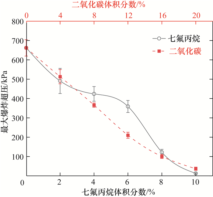 | 图 2 二氧化碳/七氟丙烷的加入对最大爆炸超压的影响 |
