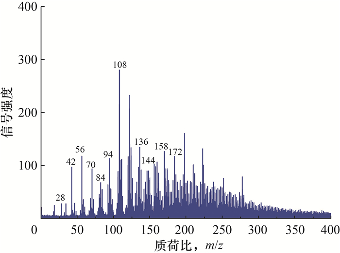 实验步骤:首先将煤尘或煤尘与植酸水雾溶液混合物的样品从50 ℃升温至650 ℃,热解产生的挥发物经软真空紫外光电离(或电子电离)和电场加速进入飞行时间质谱检测区,随后被微通道板检测器捕捉并转换为电信号。然后,捕获和放大离子信号,并将其转化成包含不同质荷比(m/z)的质谱信号,如图 2所示。此外,本文还使用热重分析仪(thermal gravimetric analyzer,TGA)来进一步分析样品的热解动力学特性,以获取样品热解过程的放热量与活化能等信息。