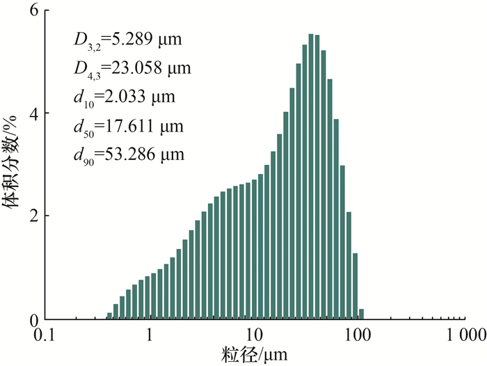实验样品选用东滩矿的煤样,其元素含量和工业分析结果详见图 3。煤尘样品的氢碳比和氧碳比分别为0.71和0.36。实验前将煤块样品粉碎并筛分,煤尘的粒径分布如图 4所示。煤尘的体积平均径D4, 3为23.058 μm,中位径d50为17.611 μm。实验中采用的植酸溶液和其他药剂均购买自国药集团。