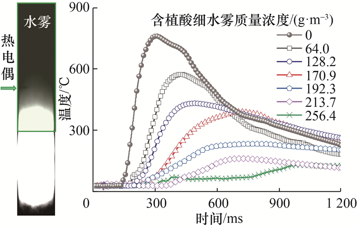 | 图 5 含植酸细水雾(体积分数20%) 对煤尘(质量分数100 g/m3) 爆炸火焰温度的影响 |