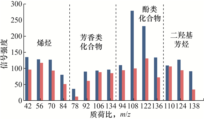 3) 实验装置在真空环境中运行,约为10-5 Pa,有效抑制了产物彼此间相互碰撞和二次反应,有利于获得初级挥发物的结构信息。