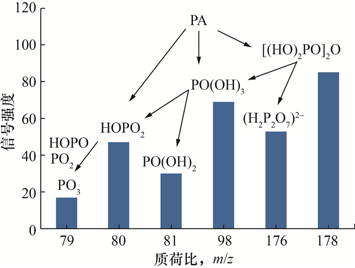 为了深入研究含植酸细水雾的热解过程和抑爆机理,本文探究了气相挥发分中主要含磷产物的组分。前人的研究表明,植酸的热解会生成焦磷酸盐、聚磷酸盐[17]以及偏磷酸[18]。图 8为含磷组分在热解过程中的主要产物和分解过程,主要产物包括焦磷酸、正磷酸、次磷酸和偏磷酸,可以推测出植酸在煤尘爆炸火焰反应区的热解路径。如图 8所示,根据原位热解飞行时间质谱测量结果,植酸对煤尘的抑制作用主要由[(HO)2PO]2O、PO(OH)3、HOPO2等小分子含磷物质决定。随着温度的升高,部分焦磷酸盐会脱水形成磷酸,其中一部分形成稳定的焦磷酸盐。磷酸会进一步形成磷酸二氢离子,然后经过加氢反应形成H2PO3(PO(OH)2),接着发生脱氢反应生成偏磷酸,最终生成HOPO、PO3、PO2等小分子物质。这些小分子含磷组分可以通过催化循环反应和自由基捕获等消耗煤尘火焰内的关键自由基(如H、OH等)。