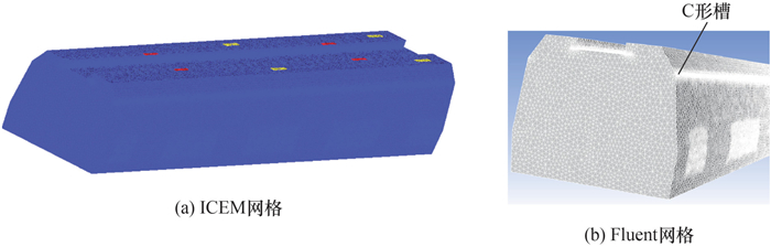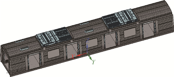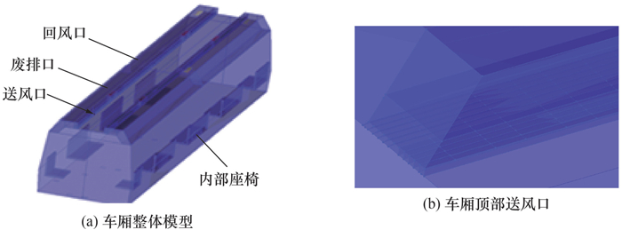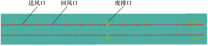 1 数值模型建立建立“上送上回”车厢仿真模型,如图 1所示。该模型通过车厢顶部布置的送风口往下均匀送风,并通过车厢顶部布置的回风口进行回风,具体送风口和回风口的布置数量以及位置参考实际车厢的三维模型和送风口布置图进行布置,沿车厢纵向均匀布置152个送风口(红色标记),如图 2和3所示。车厢内主要设施为座椅,车厢顶部共设置12个回风口(粉色标记)和4个废排口(绿色标记)。车厢送回风系统的边界条件主要包括送风边界、回风边界和废排边界。整个车厢总的进风量为10 000 m3/h,总的废排量为3 850 m3/h,车厢总回风量为6 150 m3/h。