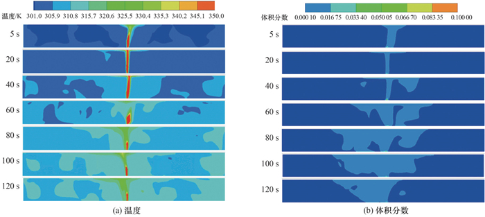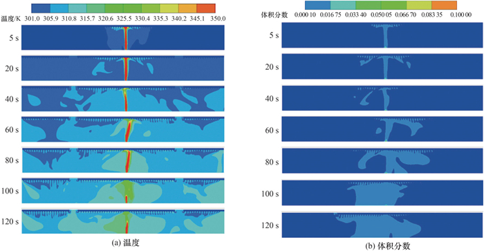 | 图 12 Y=0 m截面的温度和体积分数的分布云图(X=4.62 m) |