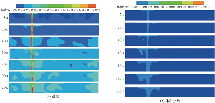 | 图 13 Y=0.46 m截面的温度和体积分数的分布云图(X=4.62 m) |