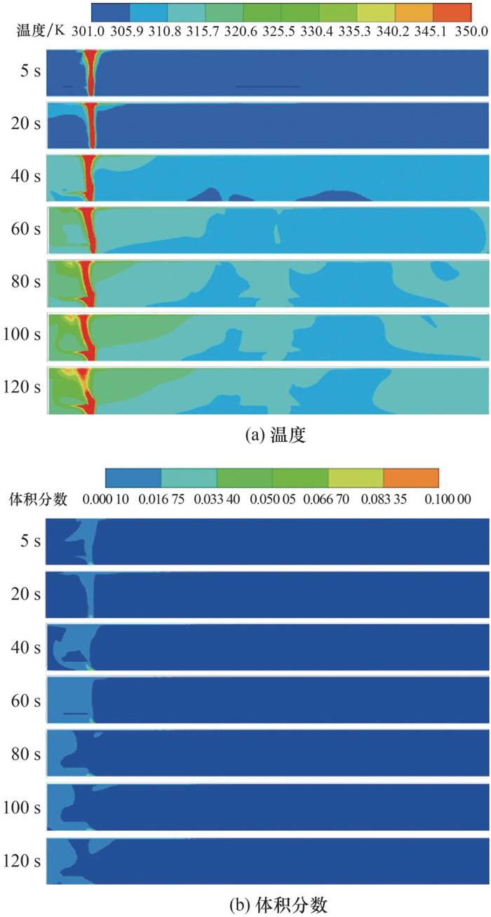 位置6火源中心坐标为X=1.85 m, Y=1.225 m。图 15展示了X截面的温度和烟气体积分数的分布云图。从温度云图可以看到,火灾发生之后,火源附近的烟气刚开始维持较好的火羽流形态,此种火灾场景下火焰会往车厢侧壁倾斜。根据C形槽所在截面的温度分布和烟气体积分数分布可以看出,随着时间的推移,C形槽内进入了少量的烟气。