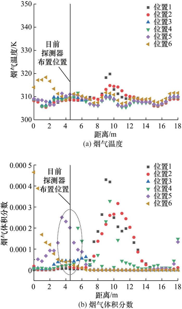 图 17分别给出了火灾发生60 s时C形槽内纵向烟气温度和体积分数分布情况。可以看到,在6种火源位置情况下,目前车厢探测器布置(在C形槽内布置2个探测器)位置处都有一定程度的温升,温度变化都不大,因此本研究主要通过烟气体积分数来优化探测器布置位置。从烟气体积分数分布情况可以看到,目前探测器布置位置已经较为合理。但是,由于探测器布置在分区中心位置,因此当火灾发生在位置1时,探测器布置位置的烟气体积分数较低,这是由于一部分烟气进入C形槽之后会通过车厢顶部的废排口排出,因而不利于烟气蔓延至火灾探测器位置。