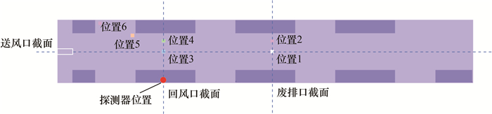 在ICEM中采用四面体网格对车厢模型进行划分,全局最大网格尺寸为0.1 m,并且对风口部分网格进行局部加密以提高计算精度。总网格数量为1 000万个,网格质量可以较好地满足Fluent的计算要求。划分网格后的计算模型如图 4所示。首先对车厢内空调送风情况下气流场特征进行分析,然后在此基础上开展6组不同火源位置的车厢内探测模拟。图 5展示了模拟的不同火源位置,考虑送风口截面、废排口截面和回风口截面,并考虑座椅遮挡等情况,共设置了6种典型的火灾场景。目前该车厢实际探测器的布置位置选取的是回风口所在截面,如图 5所示,即在车厢顶部C形槽中布置2个探测器。