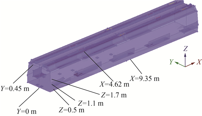 对整个车厢的送风系统进行分析之后选取一些截面,分析其流场分布特征。截面选取包括X轴、Y轴、Z轴(即车厢的长、宽、高)3个方向。沿X轴方向(即车身长度方向)选取的截面包括车厢中心截面(废排口所在截面)X=9.35 m,以及车厢回风口所在截面X=4.62 m。车厢截面位置选取示意图如图 6所示。沿Y轴方向(即车身宽度方向),由于车身沿宽度方向对称,故取一半进行分析,在Y=0 m(即车厢中心面处)、Y=0.45 m(即送风口处)取2个截面。沿Z轴方向(即车身高度方向)的截面主要取自于人体的活动区(地板位置为Z=0 m处),分别在Z=0.5 m(即人体的膝盖处)、Z=1.1 m(即座椅上的乘客头部位置和站立乘客的胸部处)、Z=1.7 m(即站立的乘客的头部处)取3个截面。