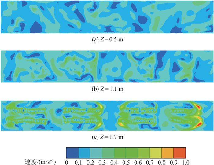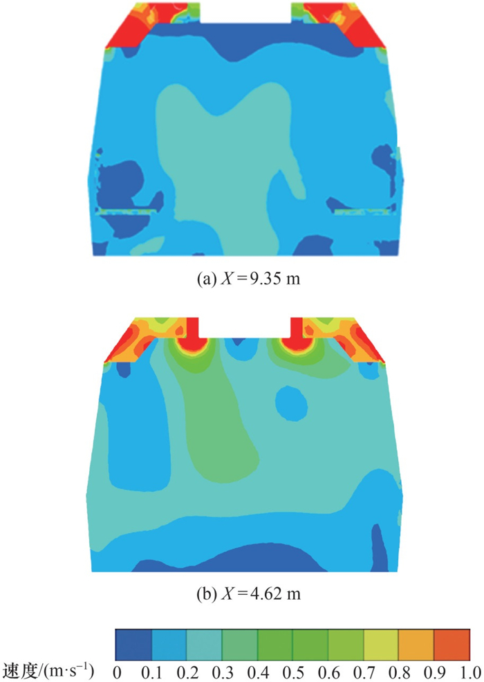 沿Z轴方向选取的典型截面的气流速度分布云图如图 9所示。可以看到,在车厢高度方向上,高度越高风速越大,并且截面的风速大小与送风口、回风口以及废排口的位置有较强的相关性。车厢回口下方的风速较大,而车厢送风口之间的风速较小,因此在进行火灾探测实验测试时,火源位置最好不要放置在车厢顶部两个送风口之间,而应放置在送风口正下方,这样烟气受到车厢顶部送风作用更大,从而更能反映火灾最不利场景。